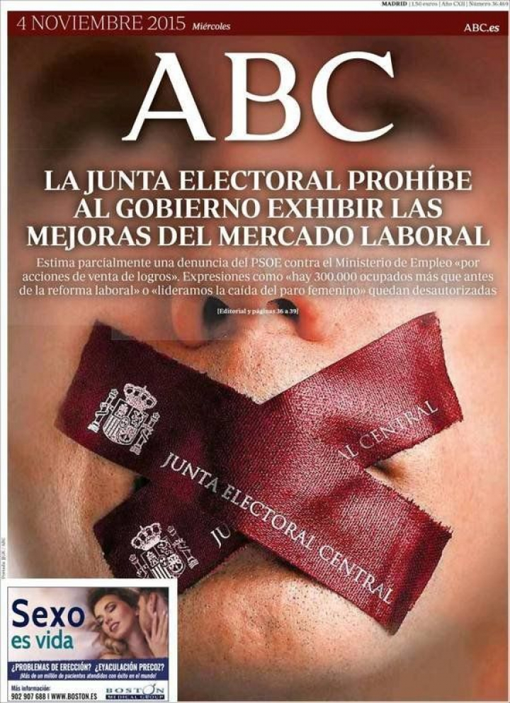 "La junta electoral prohíbe al Gobierno exhibir las mejoras del mercado laboral", se lamenta en su portada ABC, porque ha estimado parcialmente una denuncia del PSOE contra el Ministerio de Empleo "por acciones de ventas de logros"; como decir "hay 300.000 ocupados más que antes de la reforma laboral".