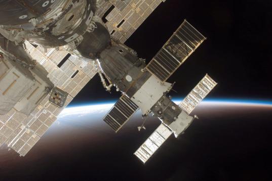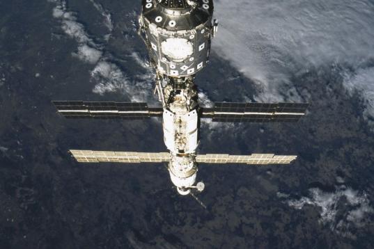 Las naves Soyuz 13 y Progress 22 (esta última era una nave no tripulada de abastecimiento), acopladas a la Estación Espacial Internacional. Diciembre de 2006.