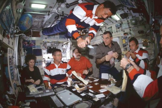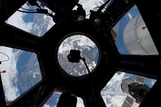 La tripulación de la Expedición 27 en el módulo Harmony de la Estación Espacial Internacional, poco después de que el transbordador espacial Endeavour se acoplara a la EEI. Mayo de 2011.