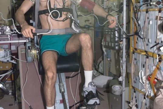 El cosmonauta Yuri Malenchenko hace ejercicio en la Estación Internacional Espacial. Agosto de 2003.