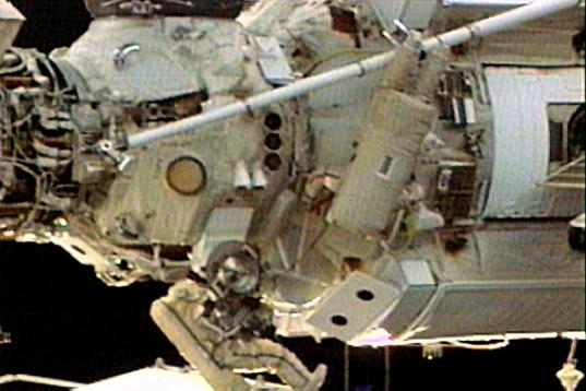El astronauta Michael López Alegría engancha su arnés al módulo Unity de la Estación Espacial Internacional. Octubre de 2000.