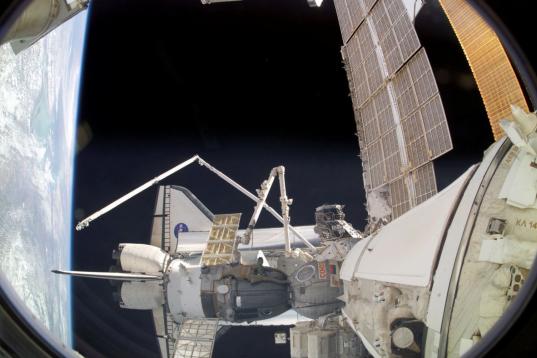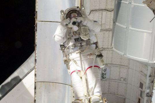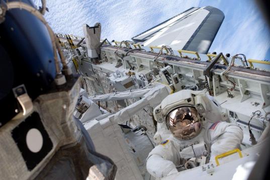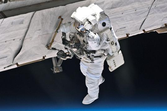 El astronauta Mike Fossum, anclado a un brazo robótico, hace una foto durante un paseo espacial de seis horas y media programado. Julio de 2011.