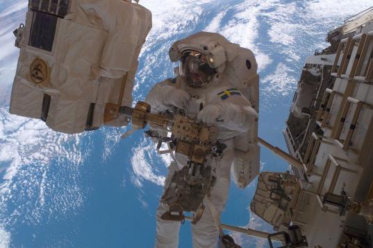 Fuglesang realiza el segundo de los tres paseos espaciales programados, durante la construcción de la Estación Espacial Internacional. Diciembre de 2006.