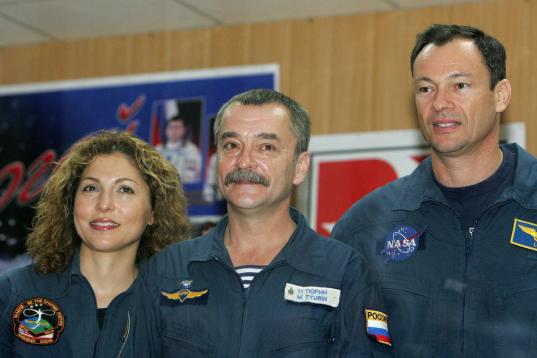 El astronauta estadounidense Michael López Alegría, el cosmonauta ruso Mikhail Tyurin y la primera mujer en hacer turismo espacial sonríen para una foto después de una rueda de prensa en Baikonur (Kazajistán). Septiembre de 2006.