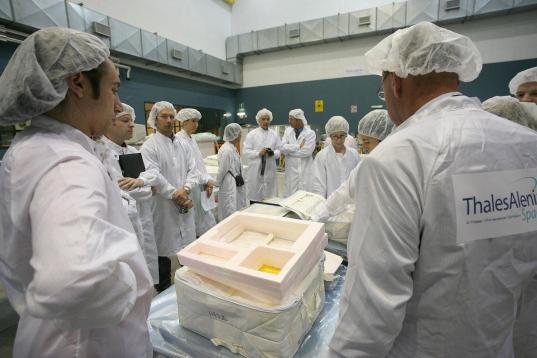 Un grupo de técnicos se encarga del embalaje de un manuscrito de Julio Verne para enviarlo al espacio. Octubre de 2007.