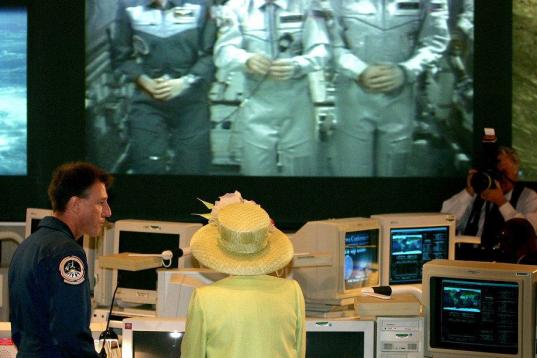 La reina Isabel II participa en una videollamada en directo desde la Estación Espacial Internacional como parte de su visita al Centro de Vuelo Espacial Goddard de la NASA en Greenbelt (Estados Unidos). Mayo de 2007.