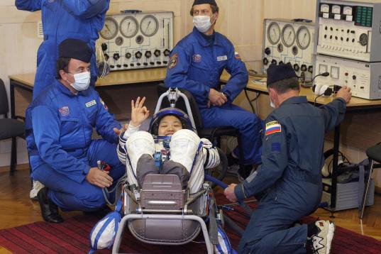 Antes de emprender su viaje hacia la Estación Espacial Internacional, miembros del personal exploran el traje espacial de la primera astronauta surcoreana, Yi So-Yeon, de 29 años. Abril de 2008.