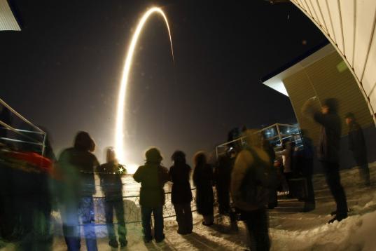 En esta foto, tomada con un objetivo ojo de pez y con un tiempo de exposición largo, se aprecia cómo unos espectadores observan el despegue del cohete Soyuz-FG con la nave Soyuz TMA-03M, donde va una nueva tripulación hacia la Estación Espac...
