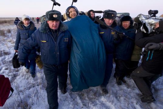 El astronauta Satoshi Furukawa sonríe mientras le llevan en una silla hacia la carpa médica minutos después de haber aterrizado en una zona remota de Kazajistán. Noviembre de 2011.
