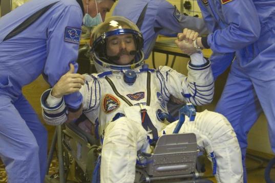 Un grupo de especialistas ayuda a Chris Hadfield, miembro canadiense de la tripulación de la Estación Espacial Internacional, a levantarse después de comprobar su traje espacial en el Cosmódromo de Baikonur en Kazajistán. Diciembre de 2012.
