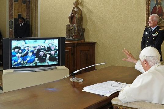 El papa Benedicto XVI saluda a los 12 astronautas a bordo de la Estación Espacial Internacional. Mayo de 2011.