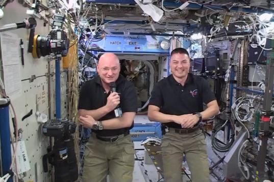 En esta captura de pantalla tomada de un vídeo que ha proporcionado la NASA, podemos ver a los astronautas Scott Kelly, a la izquierda, y Kjell Lindgren, a bordo de la EEI mientras hablan con los actores de la película Marte (The Martian). Kel...