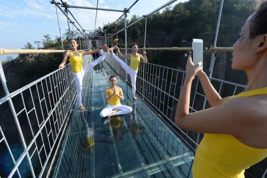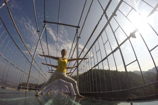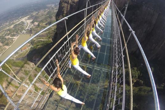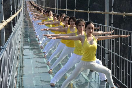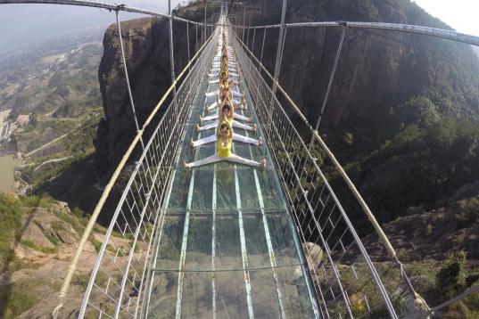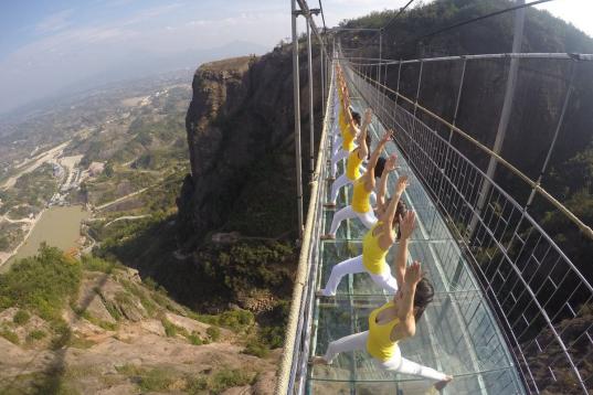 Al verlas, es difícil no acordarse de otro puente de cristal en China que se rompió recientemente. Sin embargo, estas profesionales del yoga parecen ni inmutarse.