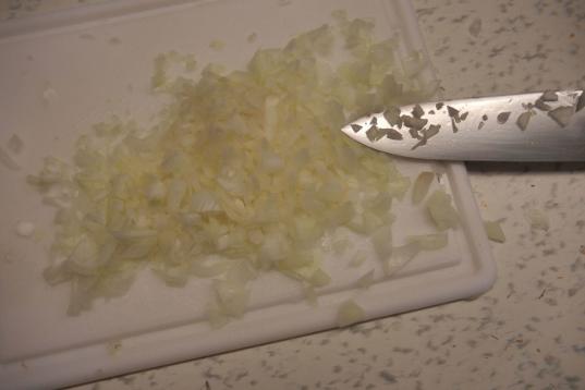 Método: cortar la cebolla utilizando un cuchillo de chef sin afilar y una tabla de cortar normal.