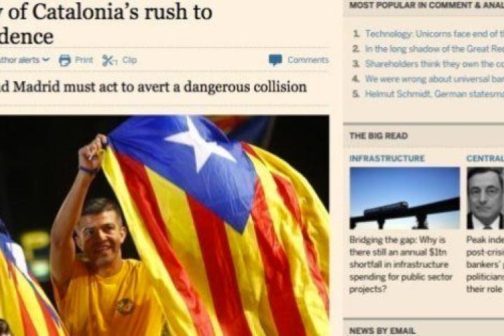 El diario británico Financial Times publica este jueves un duro editorial sobre el proceso soberanista catalán en el que tacha de "estupidez" la "carrera hacia la independencia" y avisa de que, aunque Madrid "no debe reaccionar exageradamente", es principalmente Cataluña quien debe dar primero "un paso atrás" para no "desencadenar una profunda crisis".