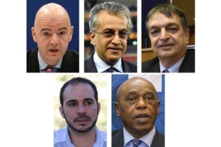 Los cinco candidatos admitidos son Ali Al Hussei (Jordania), Salman Bin Ebrahim al Khlalifa (Bahrein), Jérôme Champagne (Francia), Gianni Infantino (Suiza) y Tokyo Sexwalle (Sudáfrica).
