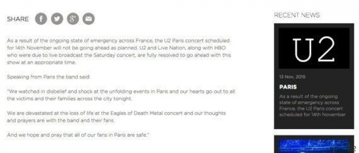 Por último, el grupo Irlandés U2 ha decidido cancelar los conciertos que tenían previstos este sábado y este domingo en París. La banda de Bono ha hecho este anuncio a través de su web. "Estamos devastados", han escrito. Y han asegurado que prometen volver a la capital francesa tan pronto como sea posible.