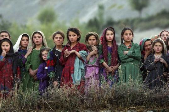 Niñas del remoto poblado de Ghumaipayan Mahnow, al norte de Afganistán, cerca de la frontera con Tajikistán, observan cómo trabajadores de Naciones Unidas descargan urnas electorales de un helicóptero para poder llevar a cabo las primeras v...
