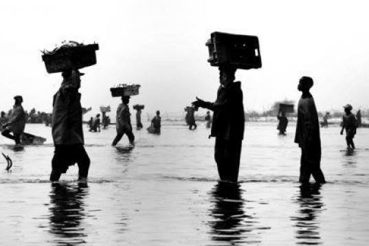 Descarga de pescado en la costa de San Luis desde los mismos cayucos con los que miles de inmigrantes senegaleses viajaban hasta las costas canarias de Fuerteventura, España. (San Luis, Senegal, 2008).