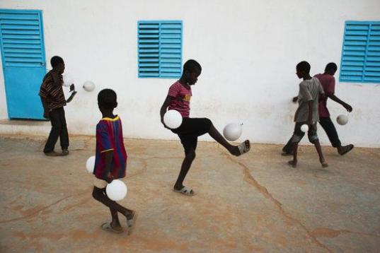 Un grupo de niños juegan al fútbol con globos después de asistir a un recital de danza sobre la escasez de agua, en la localidad de Kaedi, región de Gorgol, en Mauritania. (31 de mayo de 2012).