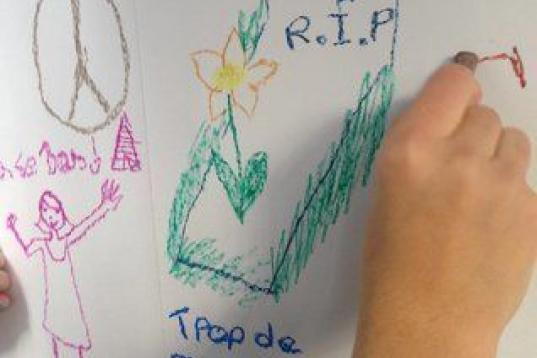 "Mi hija de 7 años ha dibujado una tumba y gente llorando, pero también muchos ramos de flores. Es su forma de decir que siempre habrá alegría, pase lo que pase", explica Marie Sophie Boivin. "La reacción de cada niño depende mucho de la edad. Un niño de 12 años ha escrito 'guerra mundial' y Violette, mi hija de 14 años, está muy afectada; es más consciente que su hermana pequeña".