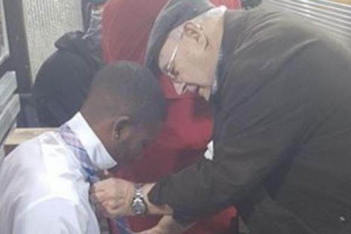 Un anciano enseña a un joven a hacerse el nudo de corbata en el metro