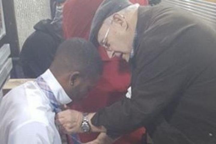 : [HUMANS & HUMANITY]The young guy sitting down was struggling with his tie. The woman in the red coat noticed, and...