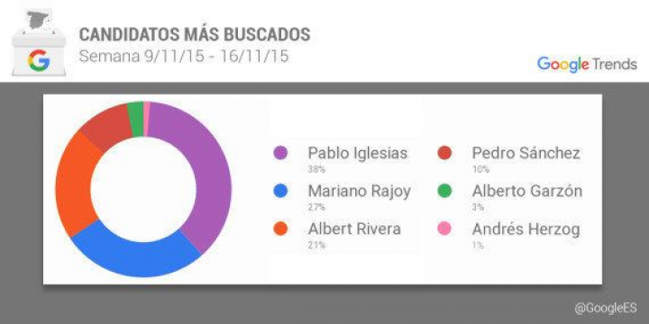 Seguimos el orden de interés que despierta cada candidato. Según Google Trends y otras herramientas internas de la compañía, Pablo Iglesias fue el más buscado (38%) en la semana del 9 al 16 de noviembre, seguido de Mariano Rajoy (27%) y Albert Rivera (21%). Los que menos curiosidad generan serían, Andrés Herzog (1%), Alberto Garzón (3%) y Pedro Sánchez (10%). "El limitado volumen de búsquedas sobre el candidato Andrés Herzog no nos ha permitido obtener resultados suficientes", aclara Google.
