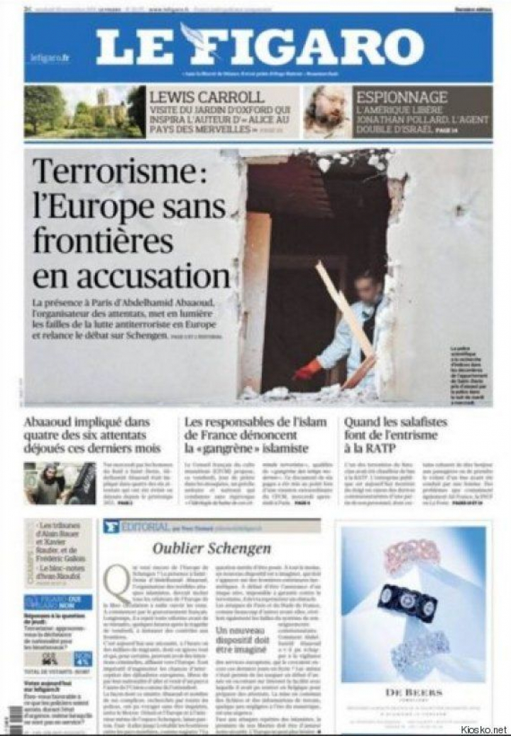 "El cerebro del ataque de París se paseó por la Unión Europea", resume El Periódico de Cataluña y el conservadorLe Figaro señala que "el terrorismo señala de manera acusadora a la Europa sin fronteras". De ahí que en su editorial pida, directamente, "olvidar Schengen" e imaginar un nuevo dispositivo que refuerce la frontera exterior e introduzca una mayor coordinación en los datos que poseen los diferentes servicios secretos.