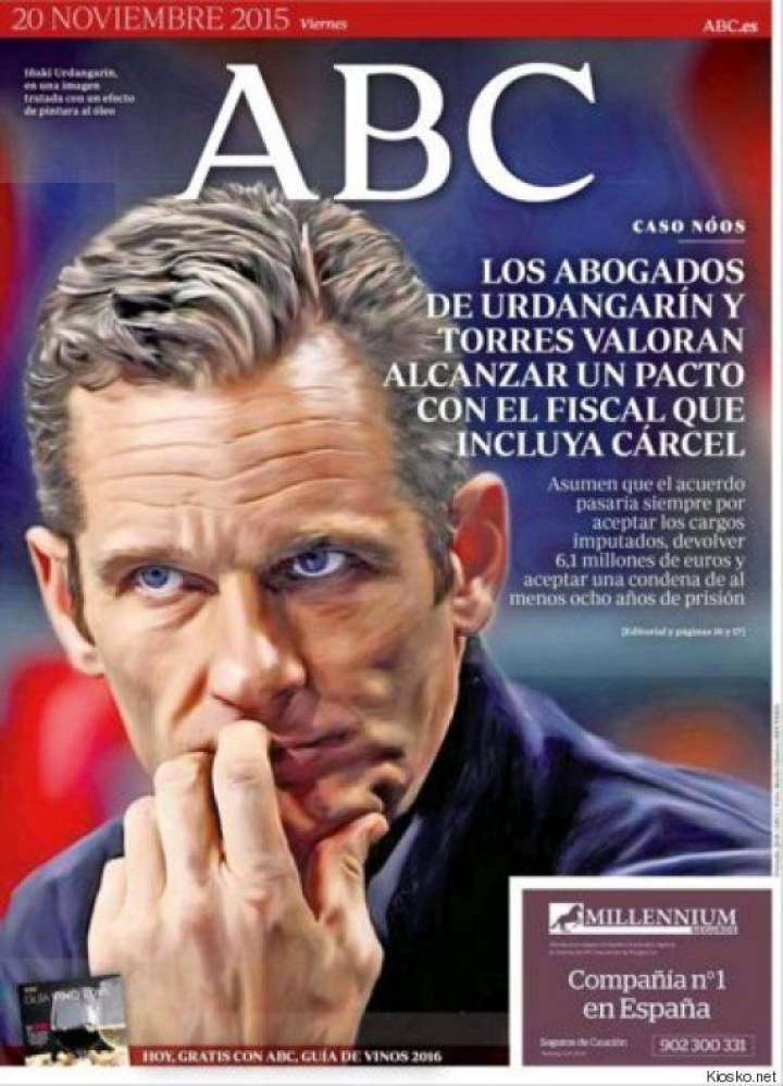 ABC dedica su portada a una información exclusiva: "los abogados de Urdangarín y Torres valoran alcanzar un pacto con el fiscal que incluya cárcel. Asumen que el acuerdo pasaría siempre por aceptar los cargos imputados, devolver 6,1 millones de euros y aceptar una condena de al menos ocho años de prisión".