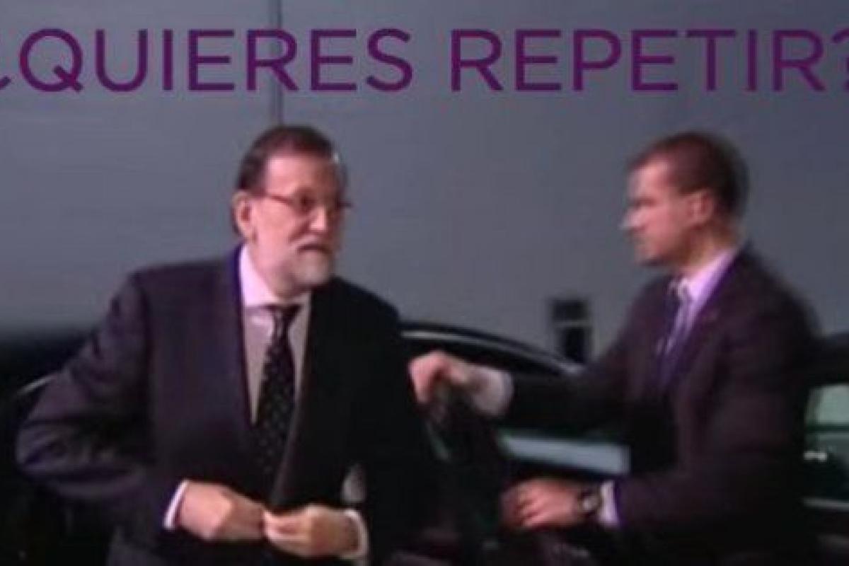 Apoyado por titulares de periódicos y con declaraciones de sus dirigentes intercaladas con frases de ministros del Ejecutivo y del propio Rajoy, la formación de Pablo Iglesias cuestiona los avances de los que presume el presidente y termina con una pregunta: "¿Quieres repetir?"