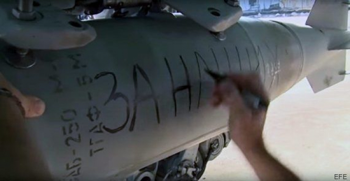 Un soldado ruso escribe "Por nuestra gente" en una de las bombas que van a lanzar contra el Daesh en Siria.