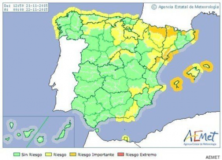 En concreto, están en aviso amarillo (riesgo) por olas Almería, Granada, Cantabria, Melilla, Alicante, Castellón, A Coruña, Lugo, Pontevedra, Vizcaya, Guipúzcoa y Asturias, mientras que tendrán activada la alerta naranja (riesgo importante) las provincias de Girona, Tarragona, Ibiza, Formentera, Mallorca y Menorca.
