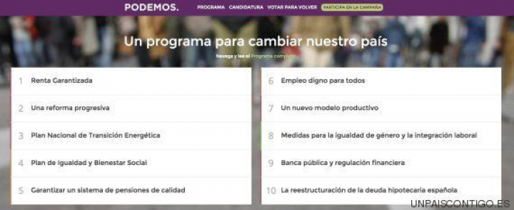 En la web, además, se destaca un decálogo de medidas incluidas dentro del programa electoral con el que la formación se presenta a las generales, entre las que destacan la renta garantizada, la banca pública, la reestructuración de la deuda y la reforma fiscal.