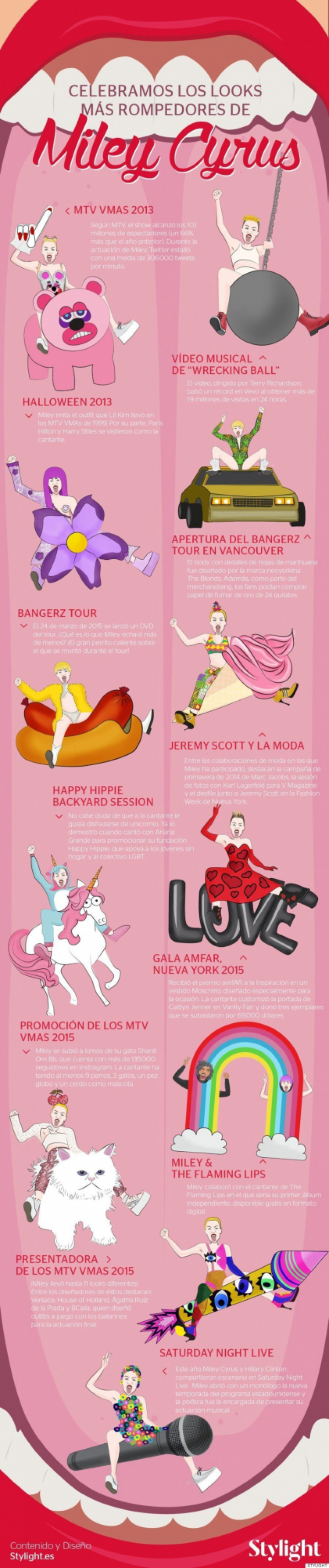 Desde entonces, Miley Cyrus ha ido superándose en extravagancia y polémica cada alfombra roja o evento que ha pisado. Para rizar el rizo, hace unos meses presentó los MTV VMA 2015 y lució 11 no-vestidos, a cual más chocante, para la ocasión. Stylight ha elaborado esta infografía que recoge sus looks más sonados y rompedores: