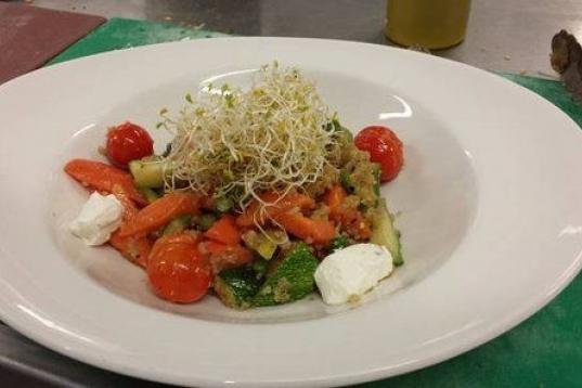 Las verduras son zanahorias, calabacín, espárragos, germen de alfalfa y tomate cherry.