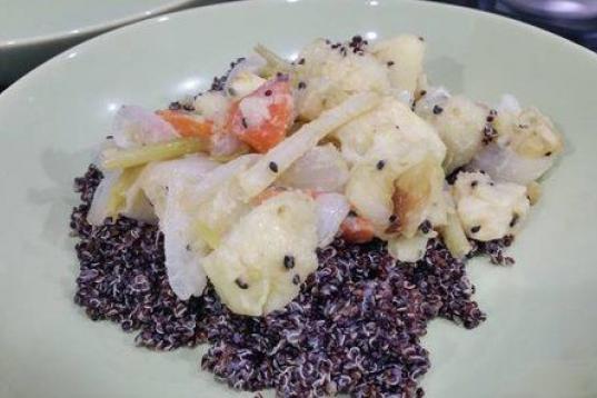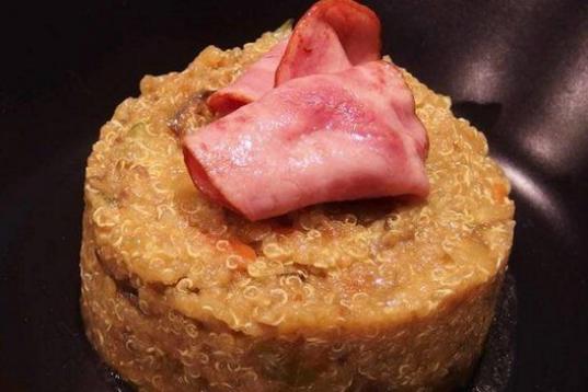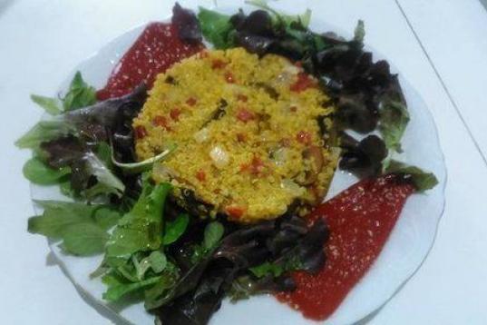 Lleva quinoa, níscalos, cebolla, pimientos del piquillo, ajos, cúrcuma y aceite de sésamo.