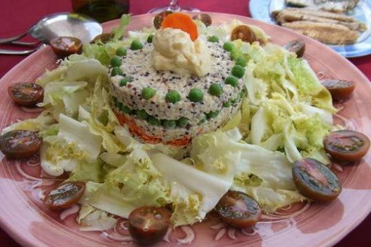 Lleva también zanahoria, guisantes, mahonesa y tomates pera.