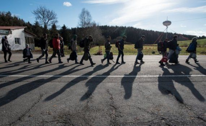 18 de noviembre de 2015. Un grupo de refugiados cruza la frontera en Wegscheid (Alemania).