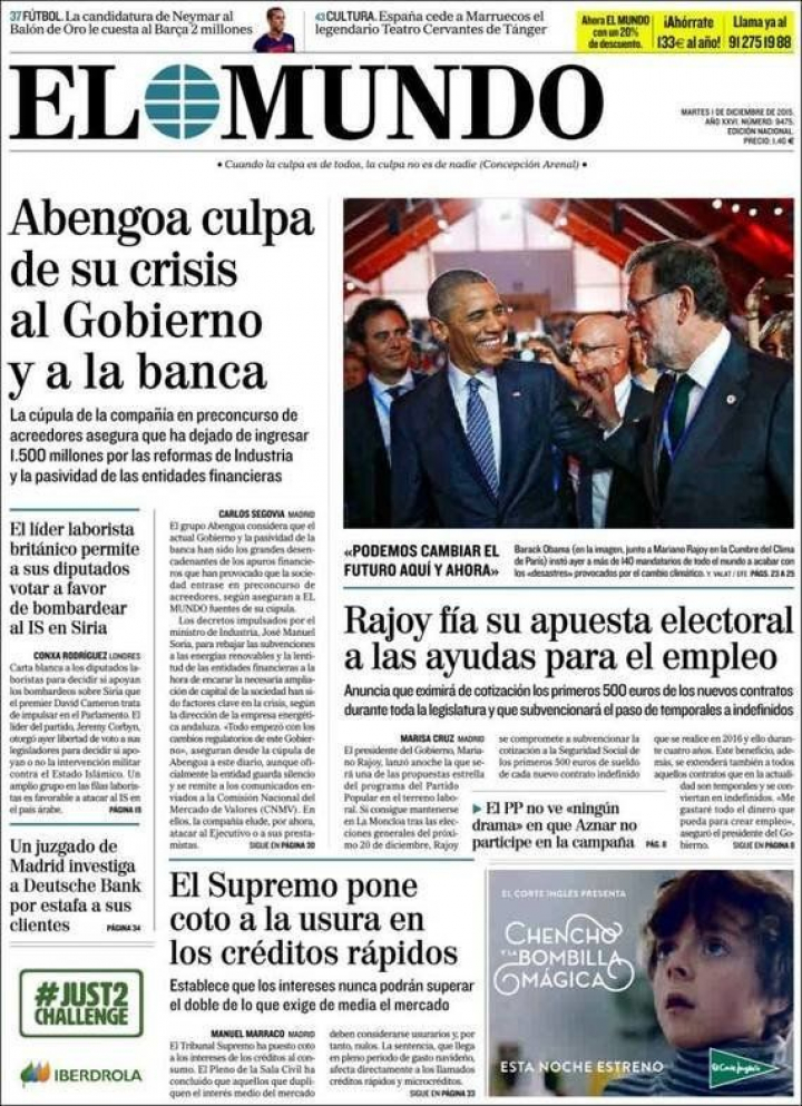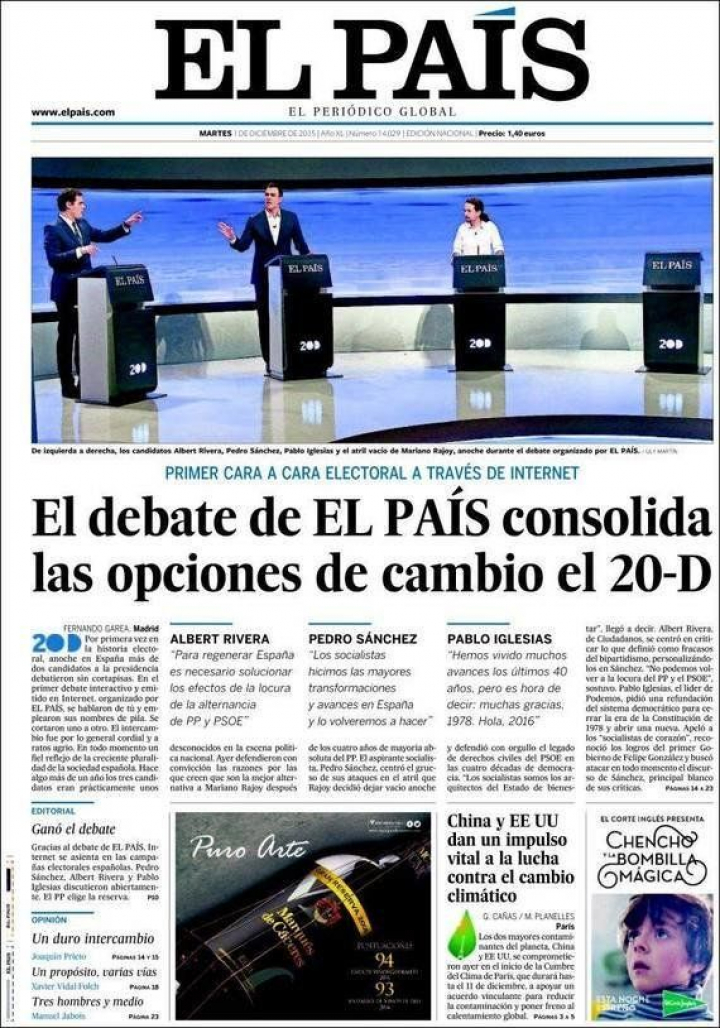 Un sonriente Obama escucha a un Mariano Rajoy que, con la mano, le hace el típico gesto de cerrar los dedos para decir "poquito". No sabemos si se refería a su inglés o a que iba a estar poco en la Cumbre del Clima de París porque debía regresar a España para colmar la ausencia del atril vacío que destaca en la foto de El País, en la que Albert Rivera, Pedro Sánchez y Pablo Iglesias debaten en "el primer cara a cara electoral a través de Internet".