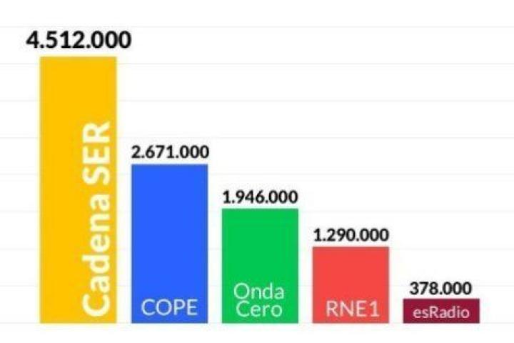 Según el último Estudio General de Medios, la Cadena SER suma de lunes a viernes 4.512.000 oyentes diarios y supera a su principal rival, la COPE, en más de 1.800.000. Esta emisora obtiene 2.671.000 oyentes; Onda Cero, 1.946.000; y RNE, 1.290.000. La Cadena SER logra una cuota de penetración del 38% y supera en quince puntos y medio a la COPE, segunda en el ranking.
