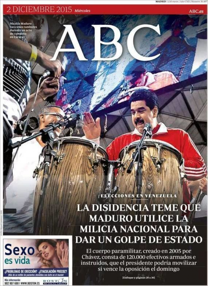 Hasta tal punto, que ABC le dedica su portada con una gran foto de su presidente tocando las congas, y el siguiente titular: "La disidencia teme que Maduro utilice la milicia nacional para dar un golpe de Estado". En este sentido, el líder opositor Henrique Capriles, en una entrevista en El Mundo, advierte: "Venezuela es una bomba que está a punto de explotar".