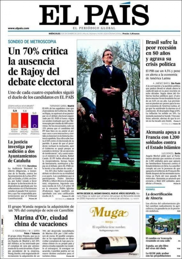 Y Mariano Rajoy no duda en volver a subirse al banco de un parque de Benavente, donde hace nueve años improvisó un mitin, obligado por el boicot al que le sometió un grupo de activistas. La instantánea figura en El País, junto al resultado de un sondeo de urgencia de Metroscopia sobre el debate del lunes, que uno de cada cuatro españoles siguió. La conclusión es que siete de cada diez critica la ausencia del presidente del Gobierno.