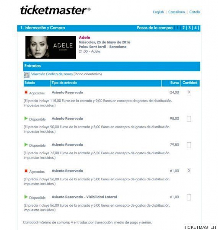 Las entradas para el segundo concierto de Adele a los pocos minutos de salir a la venta, con varias opciones agotadas (pincha en la imagen para ampliar).