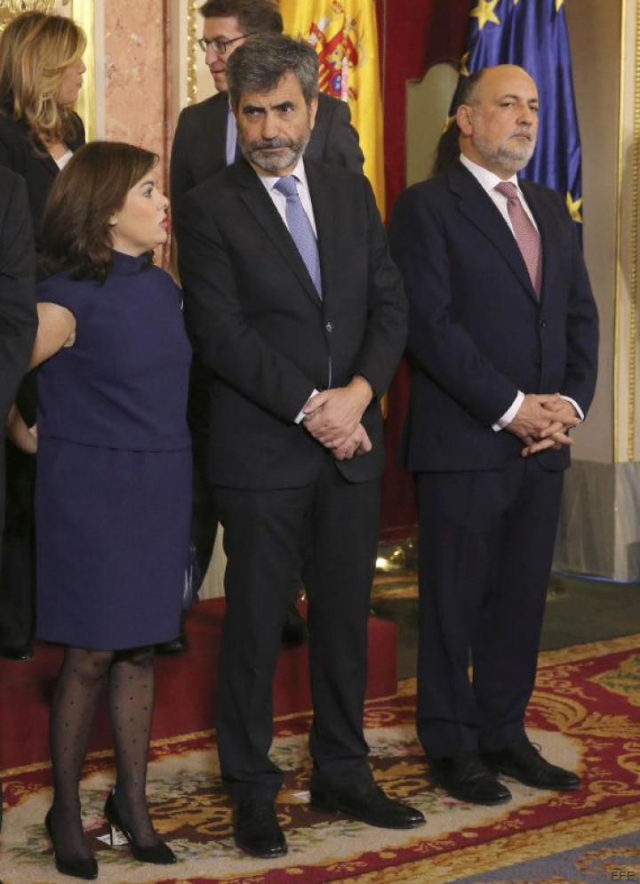 La vicepresidenta del Gobierno, Soraya Sáenz de Santamaría, con el presidente del Tribunal Supremo y del CGPJ, Carlos Lesmes y el presidente del Tribunal Constitucional, Francisco Pérez de los Cobos, en el acto del Congreso.