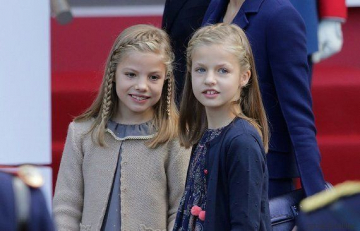 Leonor, de 10 años, sale abrazando a su hermana Sofía, de ocho, mientras ambas miran sonrientes a cámara.