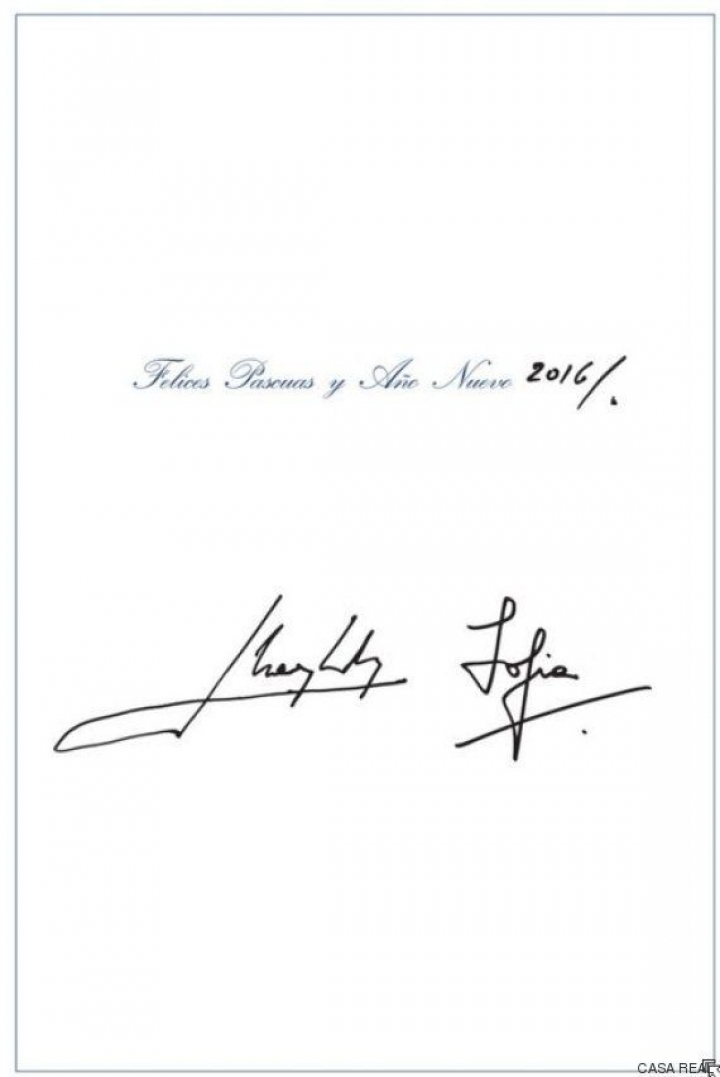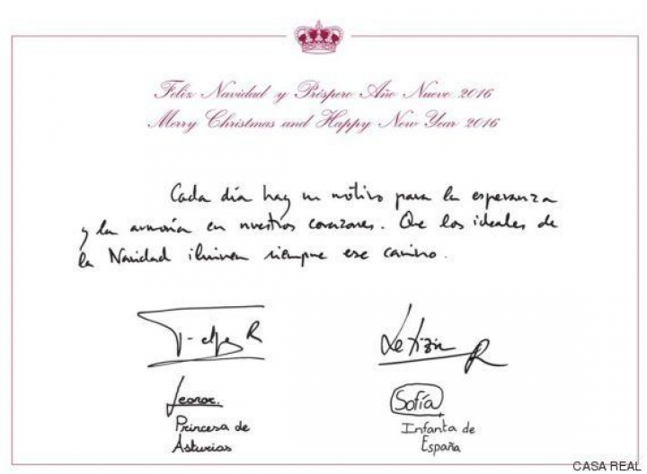 Aunque no salen en la fotografía, don Felipe y doña Letizia firman la felicitación (los dos con una R añadida a su nombre, de rey y de reina) en la que se puede leer el siguiente mensaje: "Cada día hay un motivo para la esperanza y la armonía en nuestros corazones. Que los ideales de la Navidad iluminen siempre ese camino".