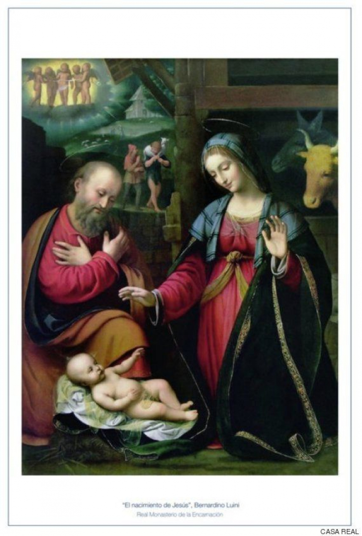 Los reyes eméritos don Juan Carlos y doña Sofía, como en años anteriores, también han querido felicitar estas fiestas con un christmas ilustrado con El nacimiento de Jesús, de Bernardino Luini, del Real Monasterio de la Encarnación