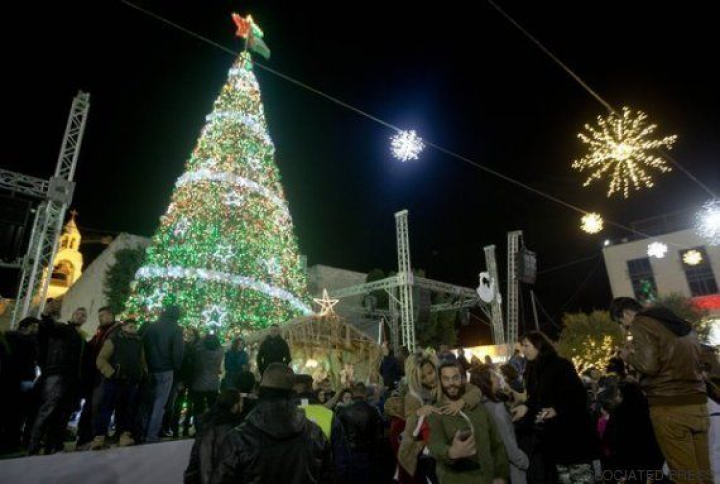 Los cristianos palestinos asisten al encendido de las luces del árbol de Navidad en la plaza Manger, a las afueras de la basílica de la Natividad en Belén. El día de Nochebuena es el mayor evento del año en esta ciudad, pero la alcaldesa Vera Baboun dijo que este año sólo decorarían la plaza Manger. El espíritu navideño será complicado de encontrar tras las semanas de enfrentamiento entre Israel y Palestina.