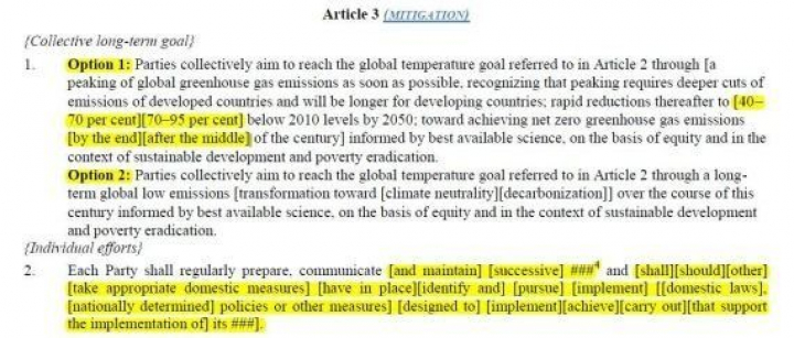 Para reducir el calentamiento global, uno de los principales métodos a seguir es la disminución de las emisiones de gases de efecto invernadero ("mitigación", en la jerga de la cumbre). Hasta entonces, el artículo que trataba el asunto de la reducción de gases de efecto invernadero era ininteligible: estaba repleto de corchetes, de incisos y de xxx.